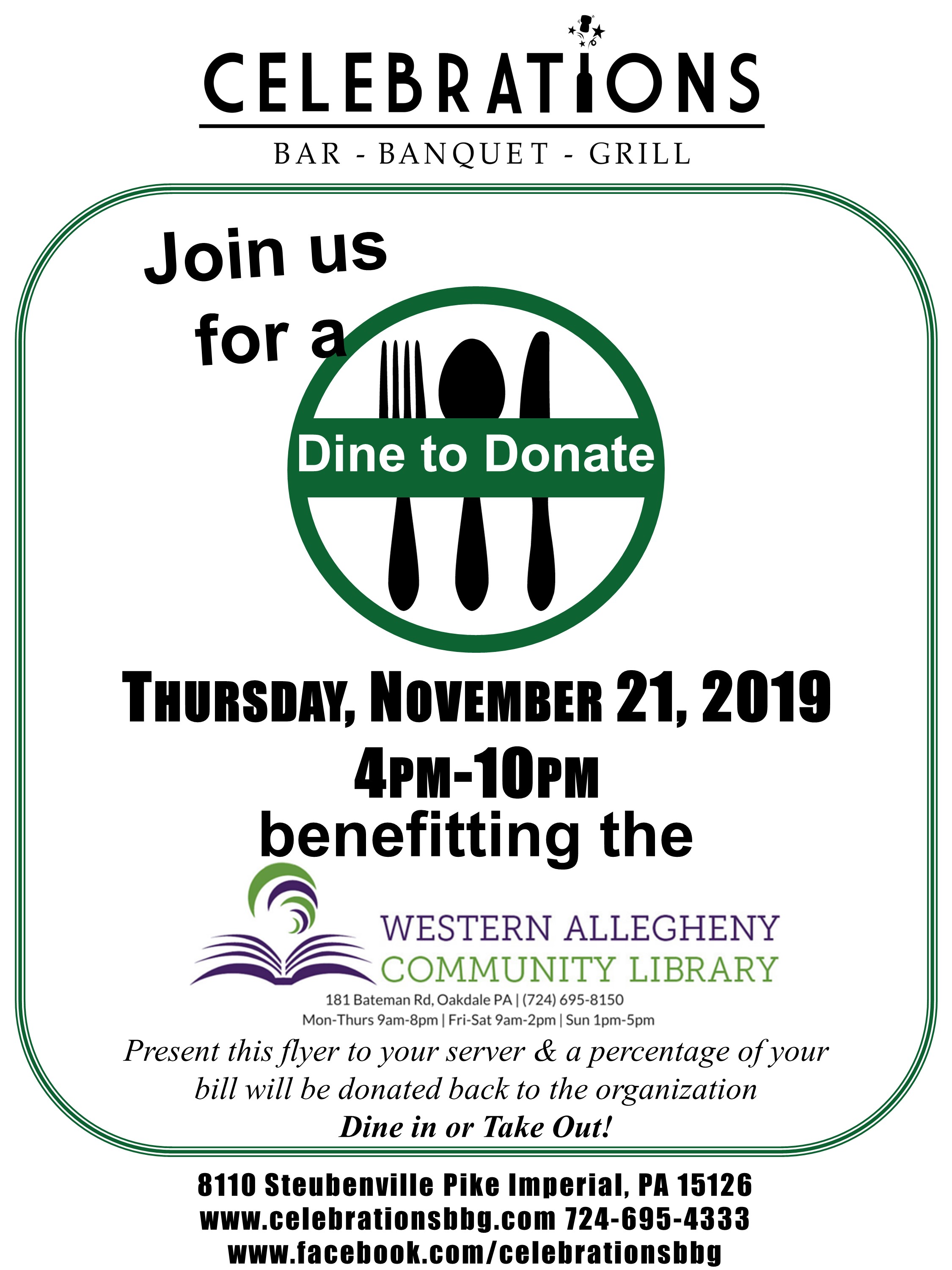 Enjoy an evening out and support your library—it’s a win-win! A portion of sales will benefit your library, dine-in or takeout. Click below to download the flyer and look for more "dine to donate" dates to be announced!