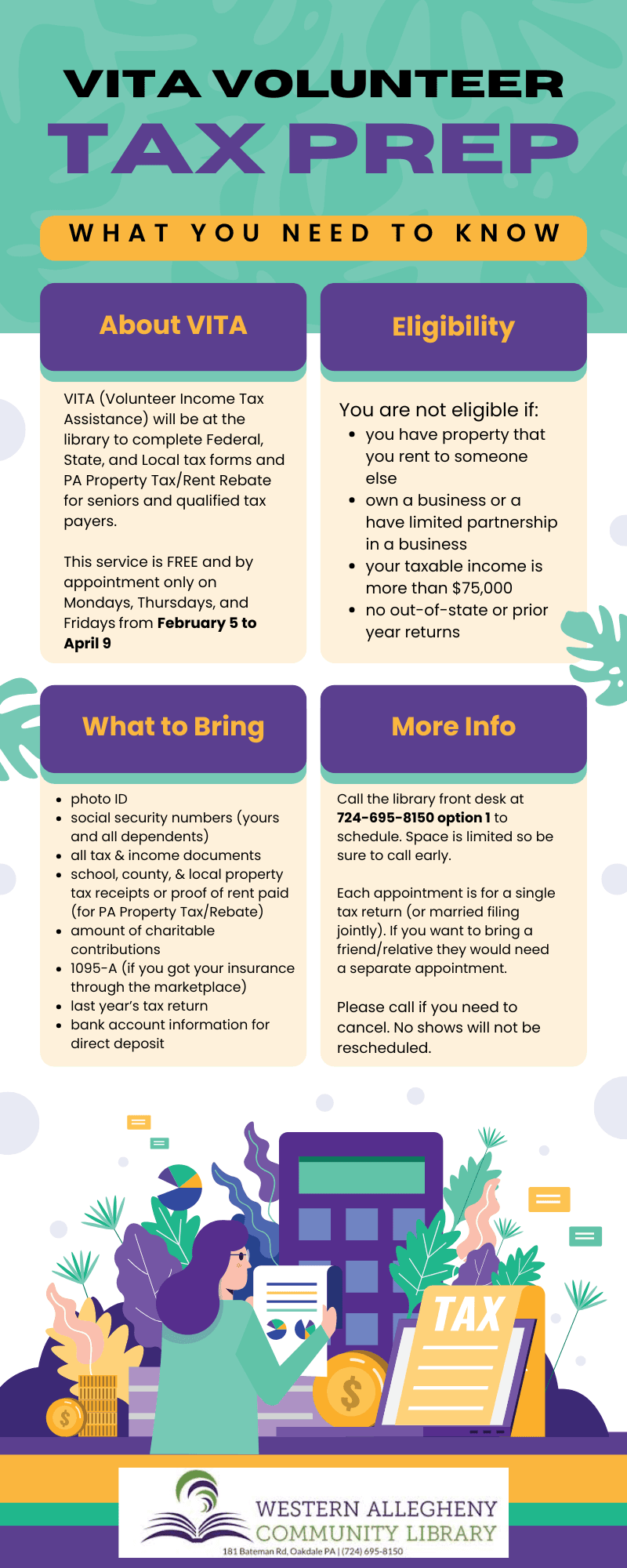 VITA (Volunteer Income Tax Assistance) will be at the library to complete Federal and PA state tax forms and PA Property Tax/Rent Rebate for seniors and qualified tax payers earning less than $75,000. This service is free and by appointment only on Mondays, Thursdays, and Fridays from February 5 to April 9. The library will begin scheduling appointments on January 12. Interested residents should call the front desk at 724-695-8150 option 1 to schedule. Space is limited so be sure to call early.
